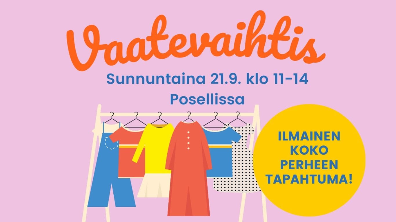 Posellissa järjestetään sunnuntaina 21. syyskuuta Vaatevaihtis -tapahtuma, jossa vaatteet vaihtavat omistajaa. Vaatteita voi viedä ja hakea ilmaiseksi. Vaatteiden tulee olla ehjiä ja puhtaita, kertoo Kirsi Ajomo Rauman Avainmartoista. Ajomo muistuttaa, että tilaisuus on tarkoitettu nimenomaan vaatteille – vastaan ei oteta kenkiä ja muutakaan ”ylimääräistä”.